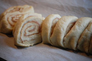 – Rol het deeg strak op en snijd de rol met een scherp mes in rolletjes van 2 cm breed.
