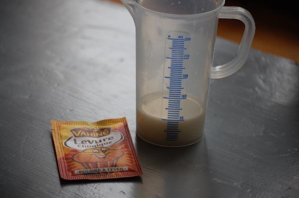 – Verwarm 50 ml melk even kort in de magnetron. Het moet lauwwarm zijn (niet kokend heet). Doe de gist erbij en laat 10 minuutjes staan.