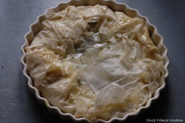 Zelf werk ik niet zo vaak met filodeeg – ik zit altijd een beetje te hannessen met die dunne velletjes, maar het is echt gewoon een kwestie van handigheid in krijgen. Laat je dus niet afschrikken. Het is echt de moeite waard. Voorzie alle velletjes van een beetje olijfolie, want dat maakt ze niet alleen minder breekbaar, je krijgt ook een prachtige lichtbruine korst.